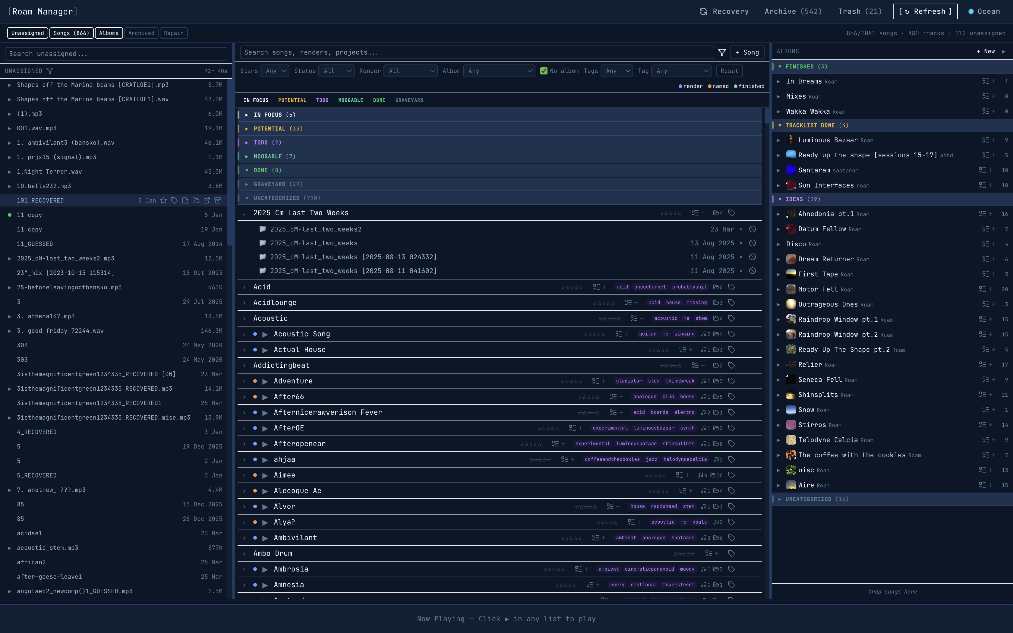 Roam Studio — three-pane song organizer showing unassigned files, organised songs, and albums